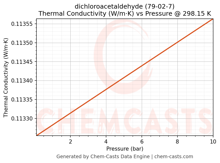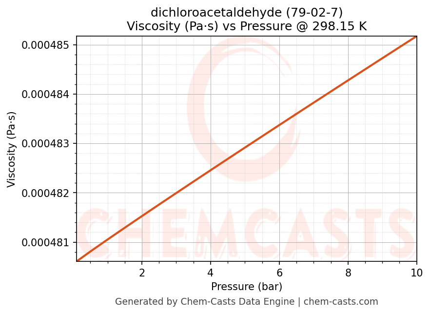 This page presents the pressure-dependent thermodynamic and transport properties of dichloroacetaldehyde (CAS 79-02-7) calculated at a constant temperature of 298 K (25 °C) over the pressure range 0.10-10 bar.