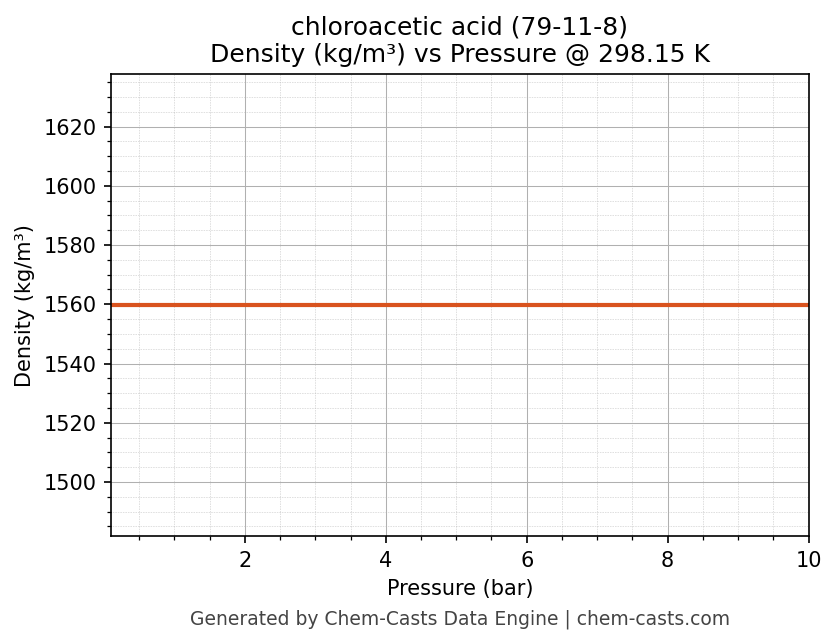 This page presents the pressure-dependent thermodynamic and transport properties of chloroacetic acid (CAS 79-11-8) calculated at a constant temperature of 298 K (25 °C) over the pressure range 0.10-10 bar.
