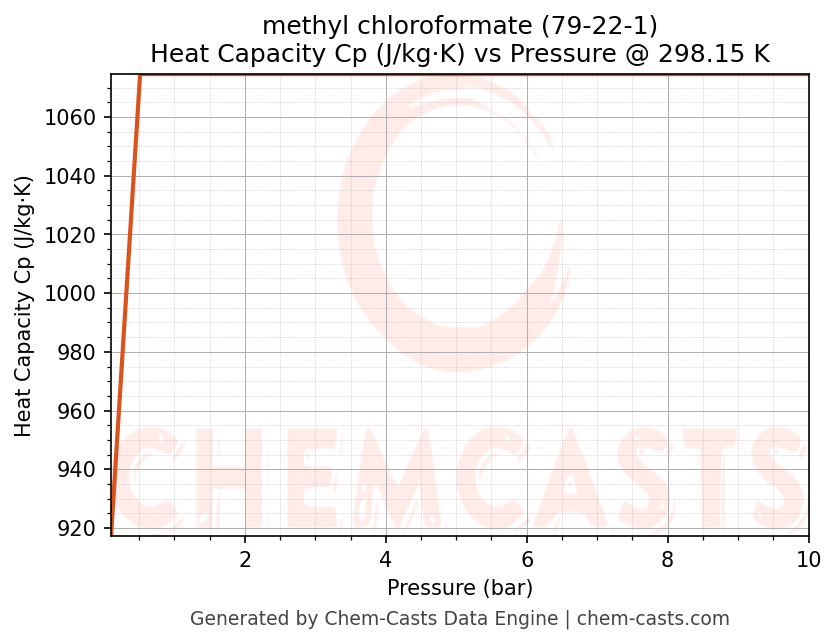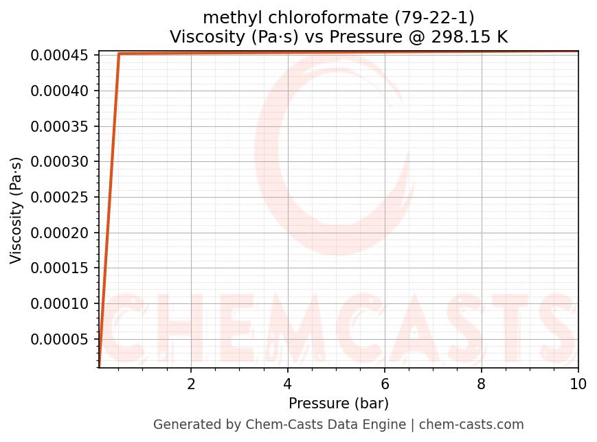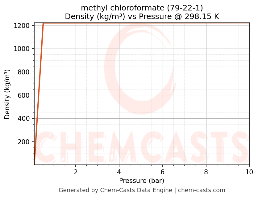 This page presents the pressure-dependent thermodynamic and transport properties of methyl chloroformate (CAS 79-22-1) calculated at a constant temperature of 298 K (25 °C) over the pressure range 0.10-10 bar.
