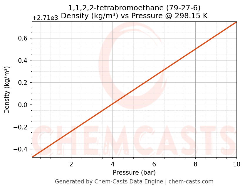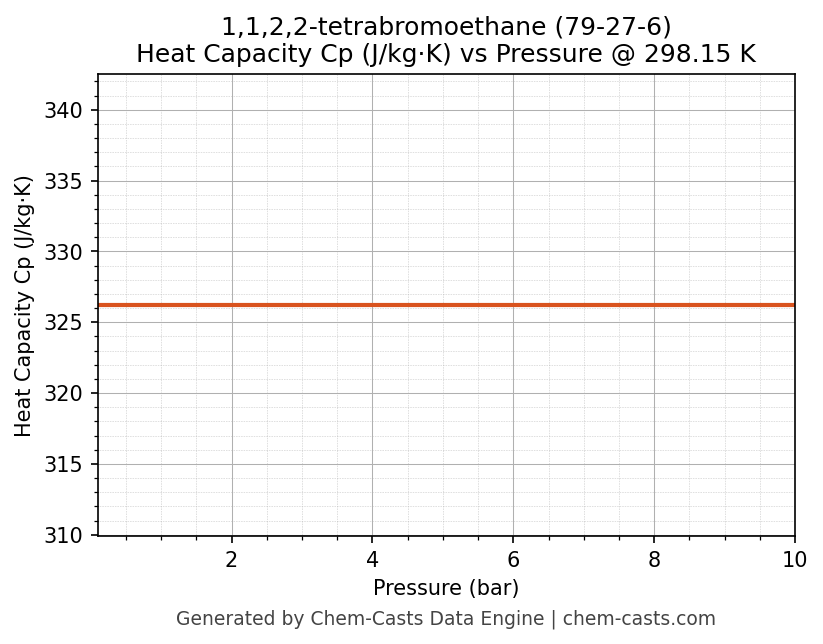 This page presents the pressure-dependent thermodynamic and transport properties of 1,1,2,2-tetrabromoethane (CAS 79-27-6) calculated at a constant temperature of 298 K (25 °C) over the pressure range 0.10-10 bar.