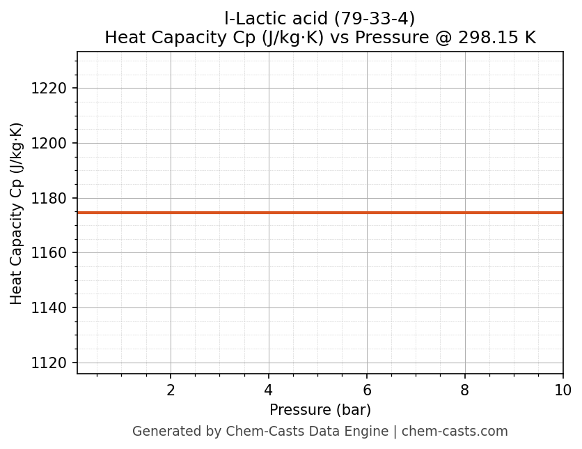 This page presents the pressure-dependent thermodynamic and transport properties of l-Lactic acid (CAS 79-33-4) calculated at a constant temperature of 298 K (25 °C) over the pressure range 0.10-10 bar.
