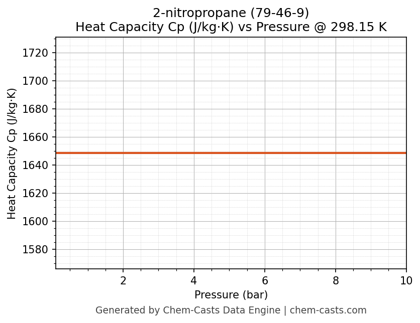 This page presents the pressure-dependent thermodynamic and transport properties of 2-nitropropane (CAS 79-46-9) calculated at a constant temperature of 298 K (25 °C) over the pressure range 0.10-10 bar.