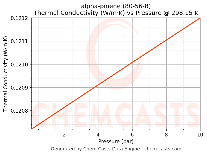 This page presents the pressure-dependent thermodynamic and transport properties of alpha-pinene (CAS 80-56-8) calculated at a constant temperature of 298 K (25 °C) over the pressure range 0.10-10 bar.