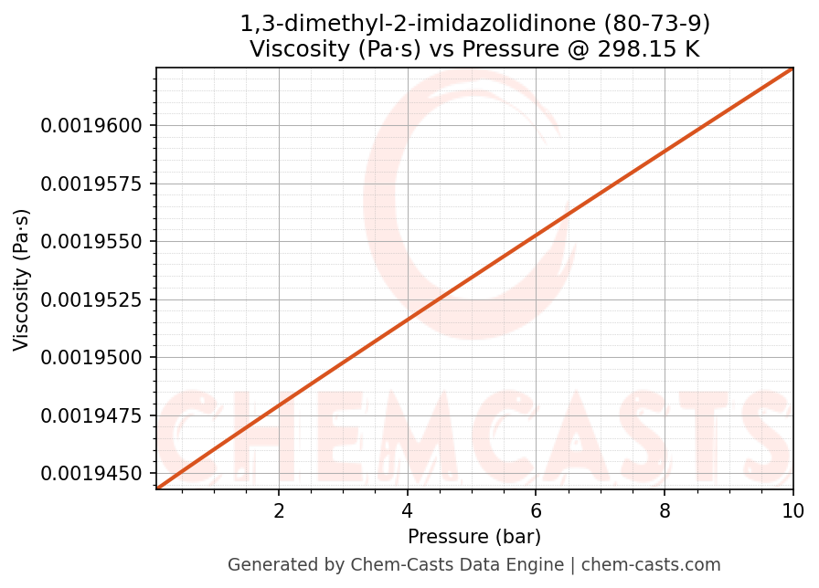 This page presents the pressure-dependent thermodynamic and transport properties of 1,3-dimethyl-2-imidazolidinone (CAS 80-73-9) calculated at a constant temperature of 298 K (25 °C) over the pressure range 0.10-10 bar.