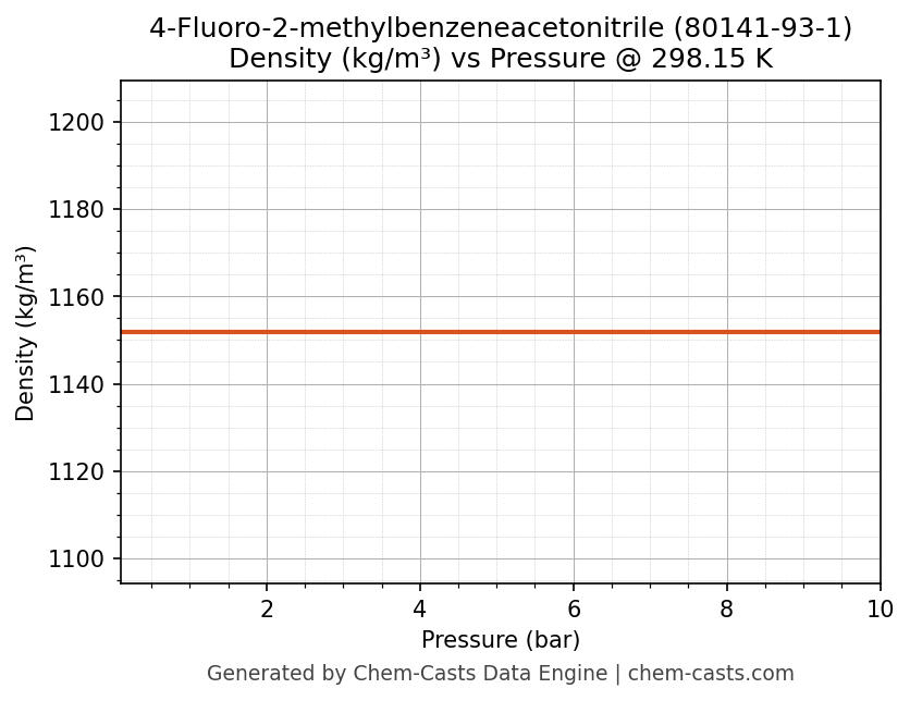 This page presents the pressure-dependent thermodynamic and transport properties of 4-Fluoro-2-methylbenzeneacetonitrile (CAS 80141-93-1) calculated at a constant temperature of 298 K (25 °C) over the pressure range 0.10-10 bar.