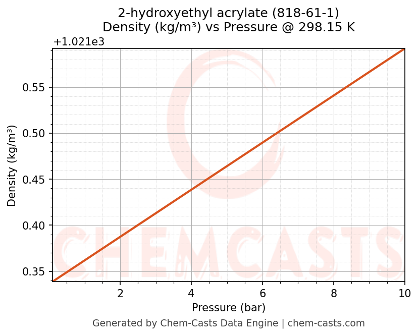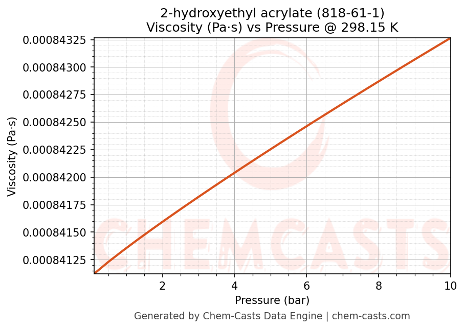 This page presents the pressure-dependent thermodynamic and transport properties of 2-hydroxyethyl acrylate (CAS 818-61-1) calculated at a constant temperature of 298 K (25 °C) over the pressure range 0.10-10 bar.