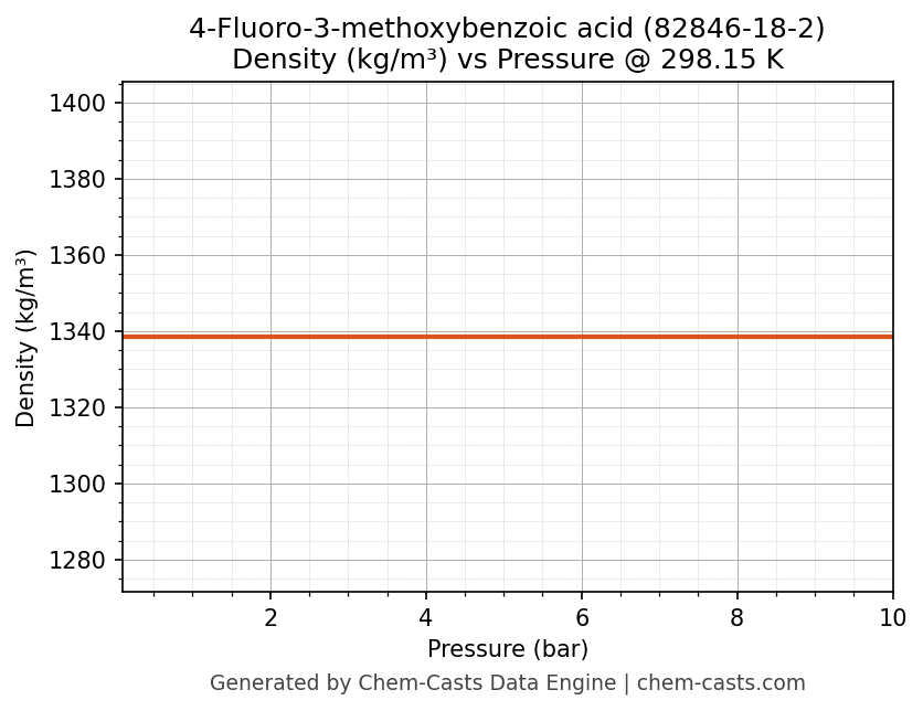This page presents the pressure-dependent thermodynamic and transport properties of 4-Fluoro-3-methoxybenzoic acid (CAS 82846-18-2) calculated at a constant temperature of 298 K (25 °C) over the pressure range 0.10-10 bar.
