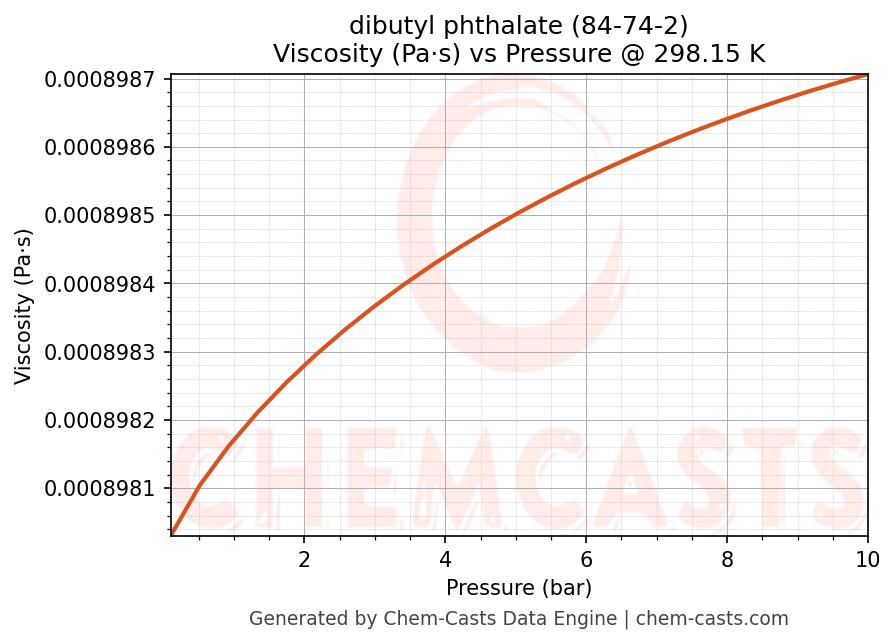 This page presents the pressure-dependent thermodynamic and transport properties of dibutyl phthalate (CAS 84-74-2) calculated at a constant temperature of 298 K (25 °C) over the pressure range 0.10-10 bar.