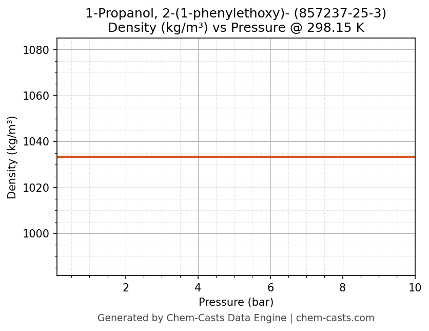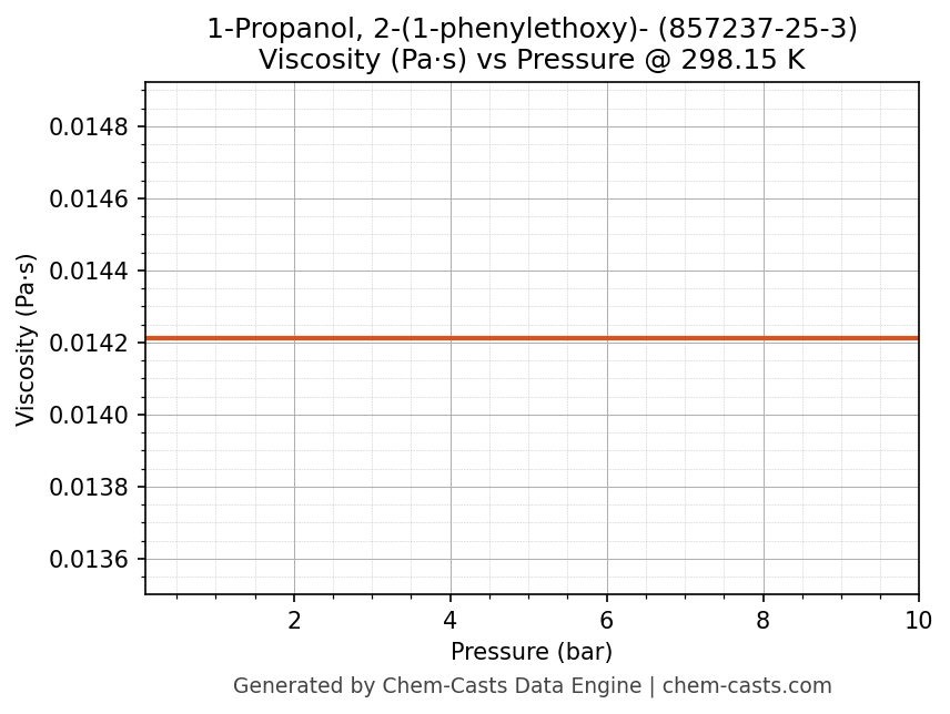 This page presents the pressure-dependent thermodynamic and transport properties of 1-Propanol, 2-(1-phenylethoxy)- (CAS 857237-25-3) calculated at a constant temperature of 298 K (25 °C) over the pressure range 0.10-10 bar.