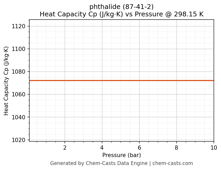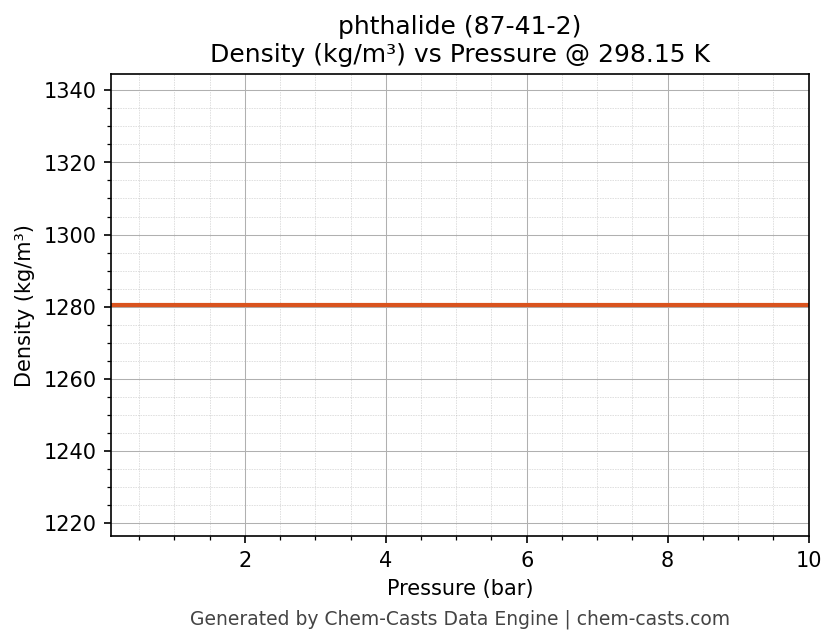 This page presents the pressure-dependent thermodynamic and transport properties of phthalide (CAS 87-41-2) calculated at a constant temperature of 298 K (25 °C) over the pressure range 0.10-10 bar.