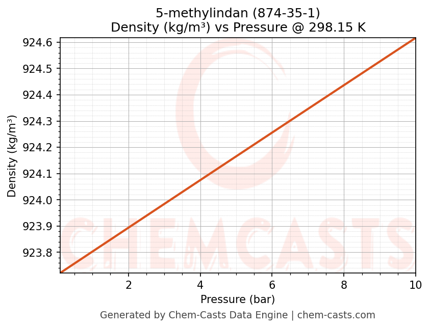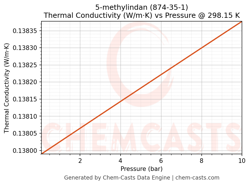 This page presents the pressure-dependent thermodynamic and transport properties of 5-methylindan (CAS 874-35-1) calculated at a constant temperature of 298 K (25 °C) over the pressure range 0.10-10 bar.