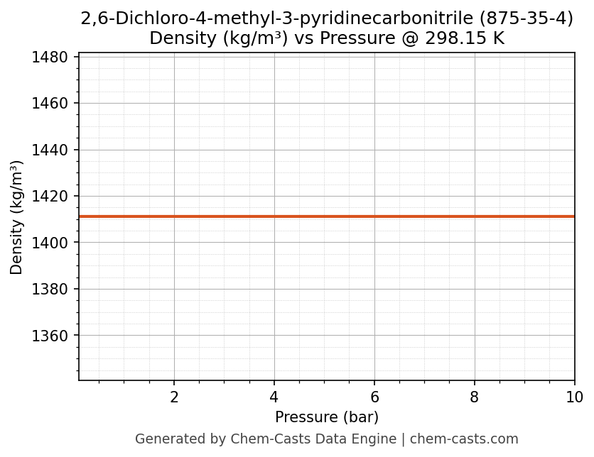 This page presents the pressure-dependent thermodynamic and transport properties of 2,6-Dichloro-4-methyl-3-pyridinecarbonitrile (CAS 875-35-4) calculated at a constant temperature of 298 K (25 °C) over the pressure range 0.10-10 bar.