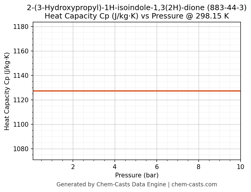 This page presents the pressure-dependent thermodynamic and transport properties of 2-(3-Hydroxypropyl)-1H-isoindole-1,3(2H)-dione (CAS 883-44-3) calculated at a constant temperature of 298 K (25 °C) over the pressure range 0.10-10 bar.