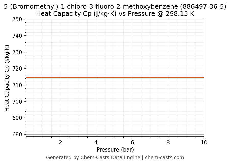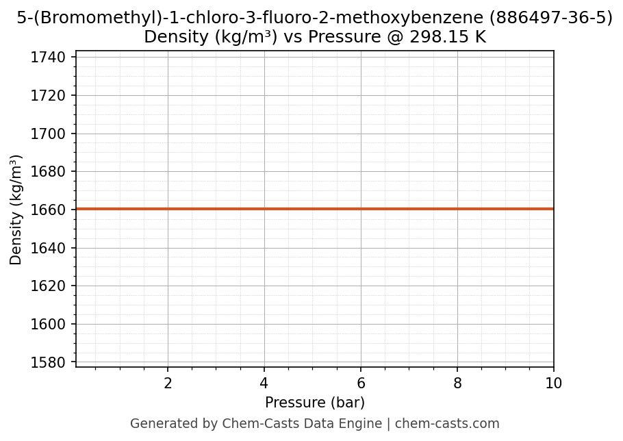 This page presents the pressure-dependent thermodynamic and transport properties of 5-(Bromomethyl)-1-chloro-3-fluoro-2-methoxybenzene (CAS 886497-36-5) calculated at a constant temperature of 298 K (25 °C) over the pressure range 0.10-10 bar.