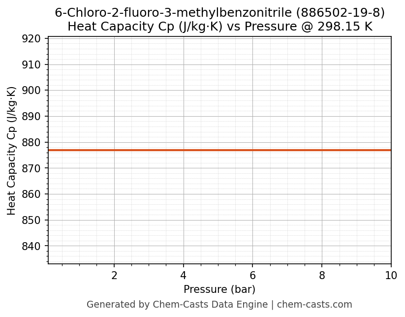 This page presents the pressure-dependent thermodynamic and transport properties of 6-Chloro-2-fluoro-3-methylbenzonitrile (CAS 886502-19-8) calculated at a constant temperature of 298 K (25 °C) over the pressure range 0.10-10 bar.