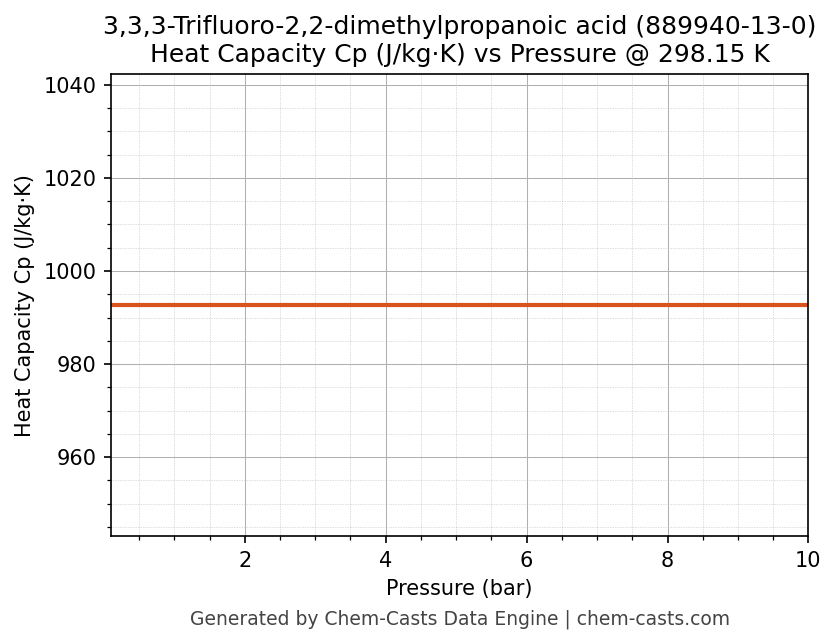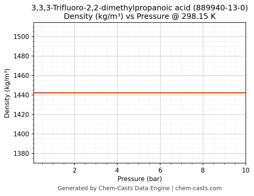 This page presents the pressure-dependent thermodynamic and transport properties of 3,3,3-Trifluoro-2,2-dimethylpropanoic acid (CAS 889940-13-0) calculated at a constant temperature of 298 K (25 °C) over the pressure range 0.10-10 bar.
