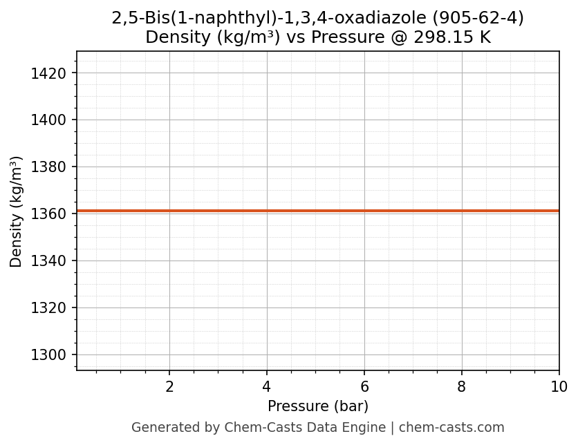 This page presents the pressure-dependent thermodynamic and transport properties of 2,5-Bis(1-naphthyl)-1,3,4-oxadiazole (CAS 905-62-4) calculated at a constant temperature of 298 K (25 °C) over the pressure range 0.10-10 bar.