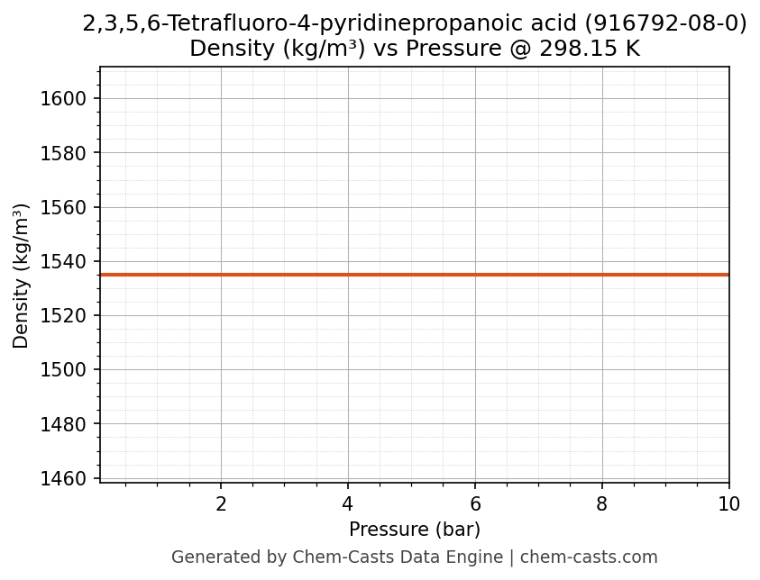 This page presents the pressure-dependent thermodynamic and transport properties of 2,3,5,6-Tetrafluoro-4-pyridinepropanoic acid (CAS 916792-08-0) calculated at a constant temperature of 298 K (25 °C) over the pressure range 0.10-10 bar.