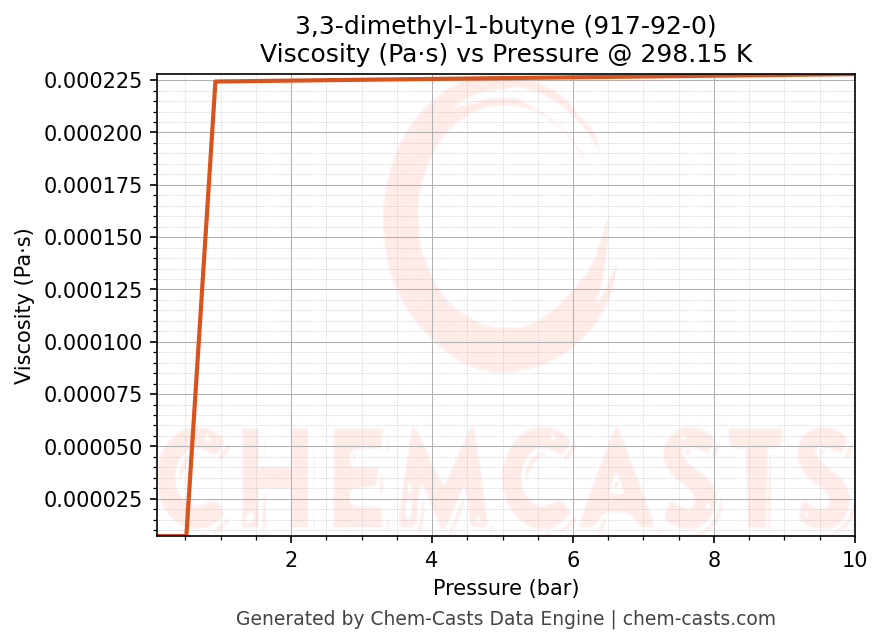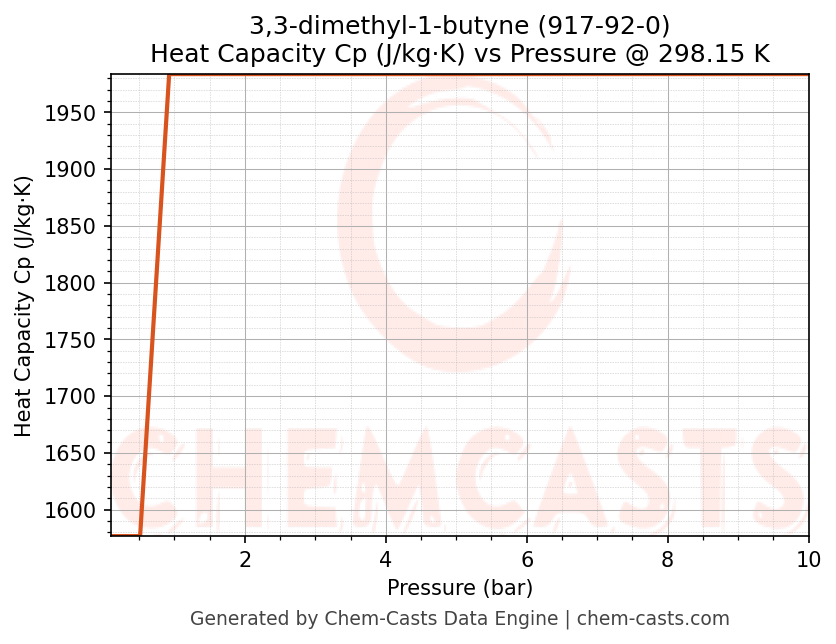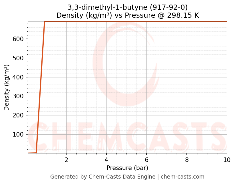 This page presents the pressure-dependent thermodynamic and transport properties of 3,3-dimethyl-1-butyne (CAS 917-92-0) calculated at a constant temperature of 298 K (25 °C) over the pressure range 0.10-10 bar.