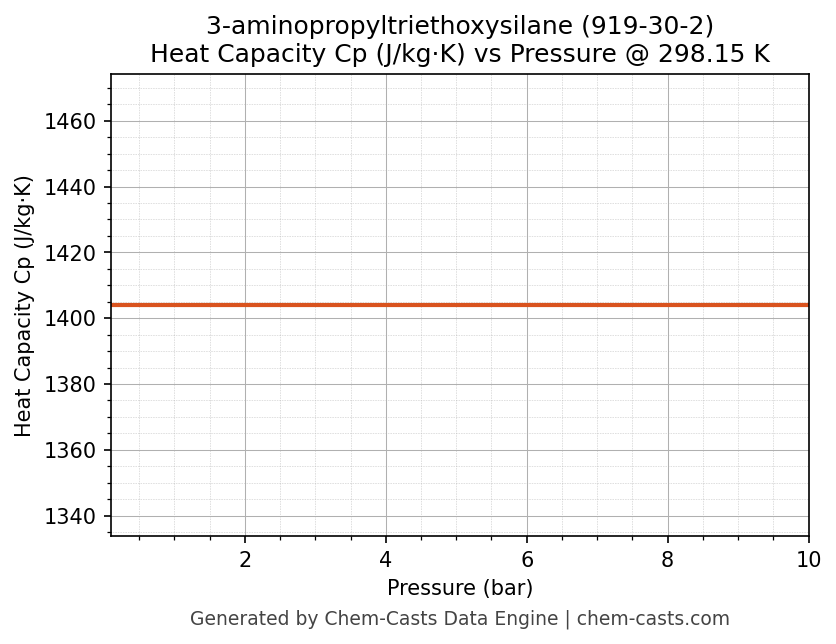 This page presents the pressure-dependent thermodynamic and transport properties of 3-aminopropyltriethoxysilane (CAS 919-30-2) calculated at a constant temperature of 298 K (25 °C) over the pressure range 0.10-10 bar.