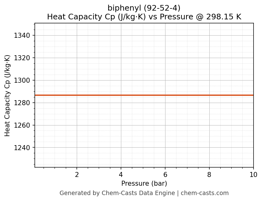 This page presents the pressure-dependent thermodynamic and transport properties of biphenyl (CAS 92-52-4) calculated at a constant temperature of 298 K (25 °C) over the pressure range 0.10-10 bar.