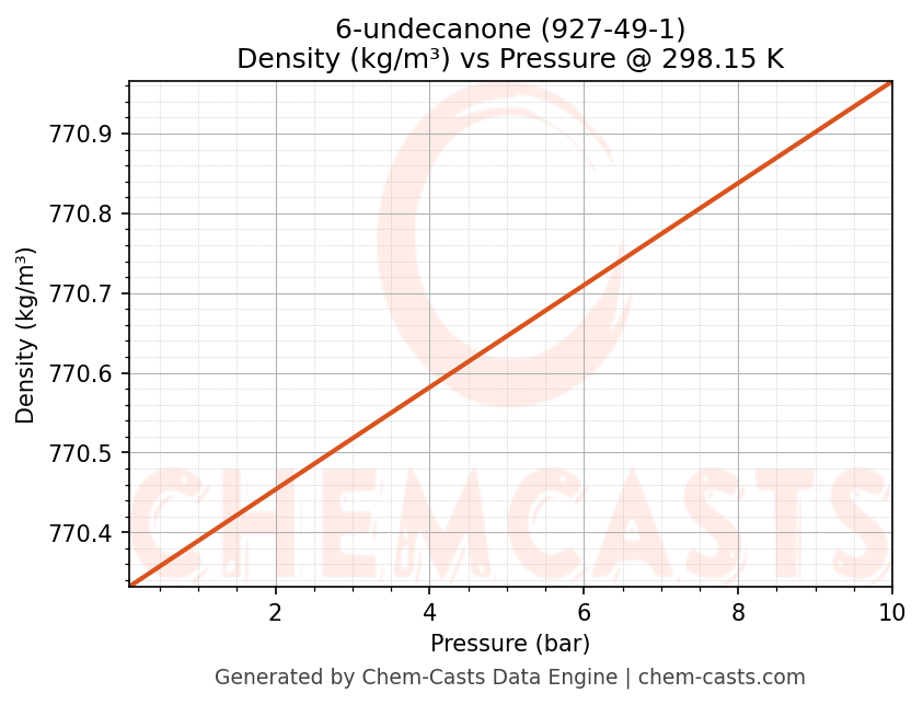 This page presents the pressure-dependent thermodynamic and transport properties of 6-undecanone (CAS 927-49-1) calculated at a constant temperature of 298 K (25 °C) over the pressure range 0.10-10 bar.