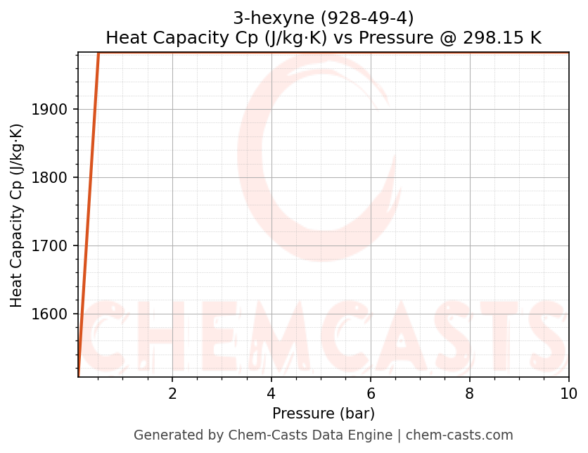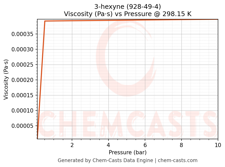 This page presents the pressure-dependent thermodynamic and transport properties of 3-hexyne (CAS 928-49-4) calculated at a constant temperature of 298 K (25 °C) over the pressure range 0.10-10 bar.