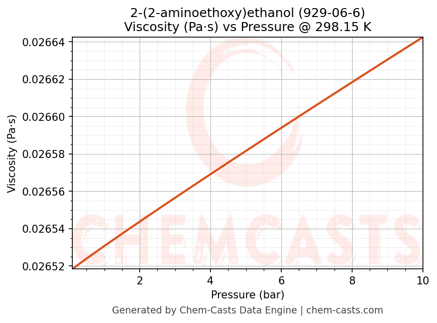 This page presents the pressure-dependent thermodynamic and transport properties of 2-(2-aminoethoxy)ethanol (CAS 929-06-6) calculated at a constant temperature of 298 K (25 °C) over the pressure range 0.10-10 bar.