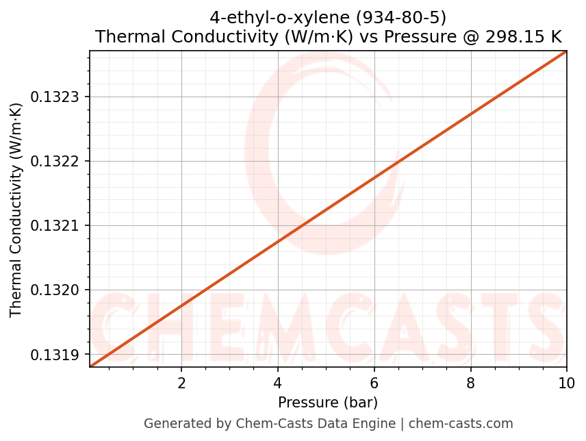 This page presents the pressure-dependent thermodynamic and transport properties of 4-ethyl-o-xylene (CAS 934-80-5) calculated at a constant temperature of 298 K (25 °C) over the pressure range 0.10-10 bar.