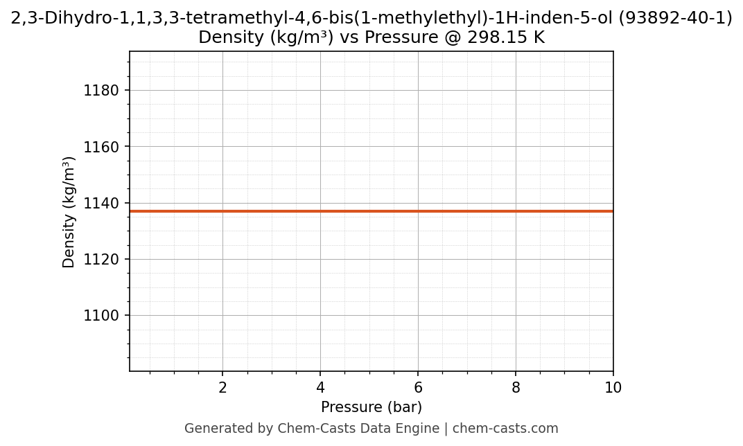 This page presents the pressure-dependent thermodynamic and transport properties of 2,3-Dihydro-1,1,3,3-tetramethyl-4,6-bis(1-methylethyl)-1H-inden-5-ol (CAS 93892-40-1) calculated at a constant temperature of 298 K (25 °C) over the pressure range 0.10-10 bar.