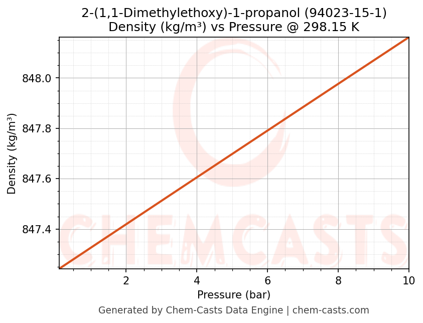 This page presents the pressure-dependent thermodynamic and transport properties of 2-(1,1-Dimethylethoxy)-1-propanol (CAS 94023-15-1) calculated at a constant temperature of 298 K (25 °C) over the pressure range 0.10-10 bar.
