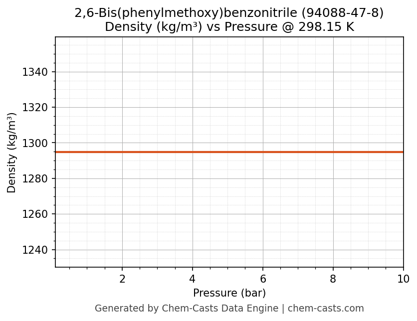 This page presents the pressure-dependent thermodynamic and transport properties of 2,6-Bis(phenylmethoxy)benzonitrile (CAS 94088-47-8) calculated at a constant temperature of 298 K (25 °C) over the pressure range 0.10-10 bar.