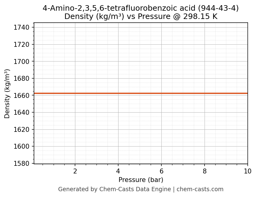 This page presents the pressure-dependent thermodynamic and transport properties of 4-Amino-2,3,5,6-tetrafluorobenzoic acid (CAS 944-43-4) calculated at a constant temperature of 298 K (25 °C) over the pressure range 0.10-10 bar.