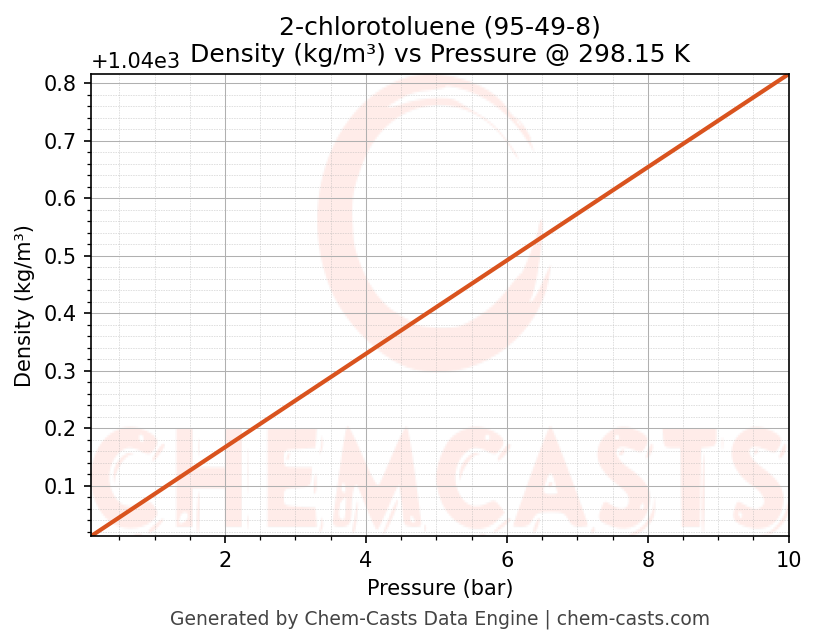 This page presents the pressure-dependent thermodynamic and transport properties of 2-chlorotoluene (CAS 95-49-8) calculated at a constant temperature of 298 K (25 °C) over the pressure range 0.10-10 bar.