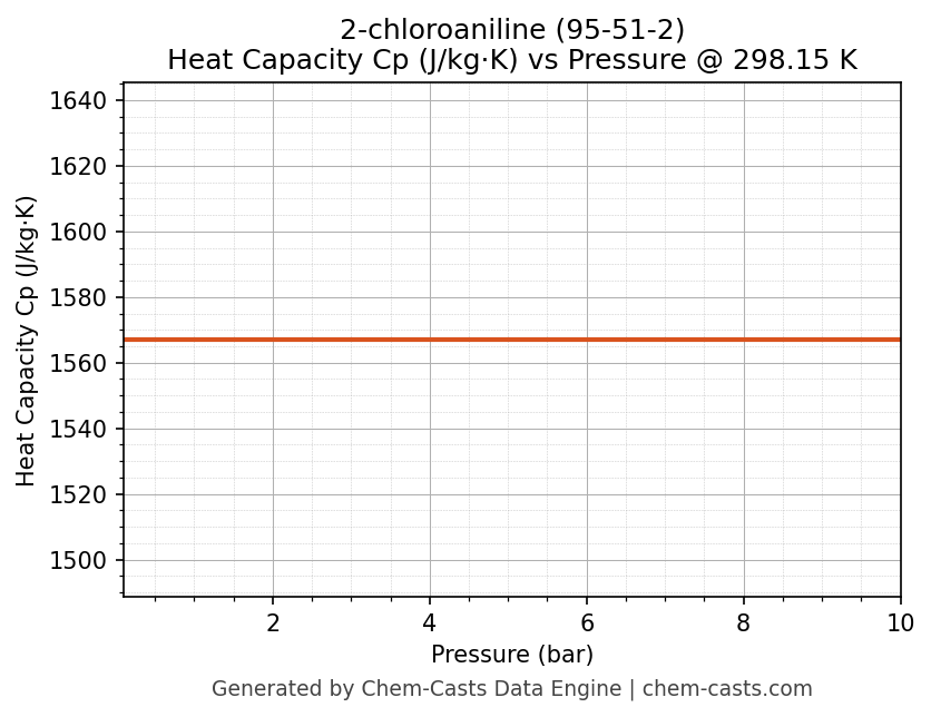 This page presents the pressure-dependent thermodynamic and transport properties of 2-chloroaniline (CAS 95-51-2) calculated at a constant temperature of 298 K (25 °C) over the pressure range 0.10-10 bar.