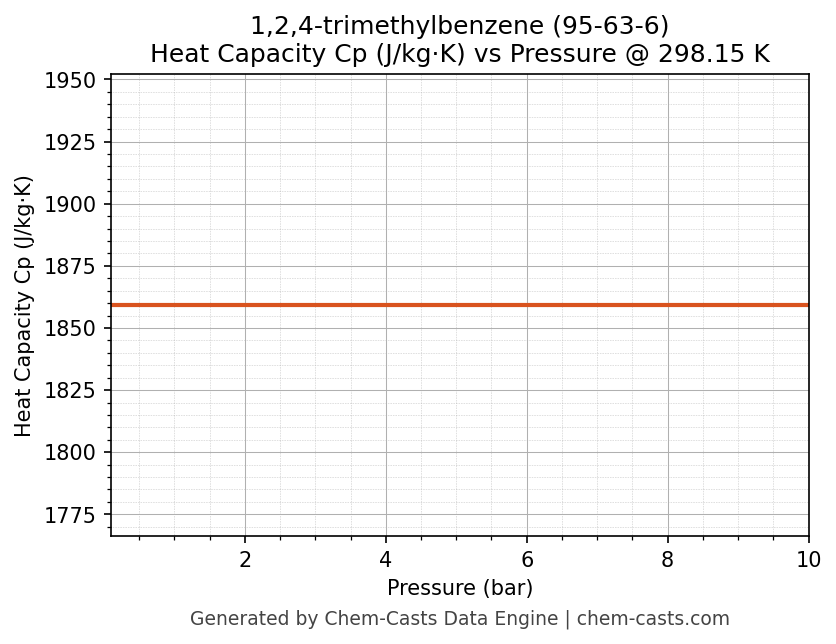 This page presents the pressure-dependent thermodynamic and transport properties of 1,2,4-trimethylbenzene (CAS 95-63-6) calculated at a constant temperature of 298 K (25 °C) over the pressure range 0.10-10 bar.