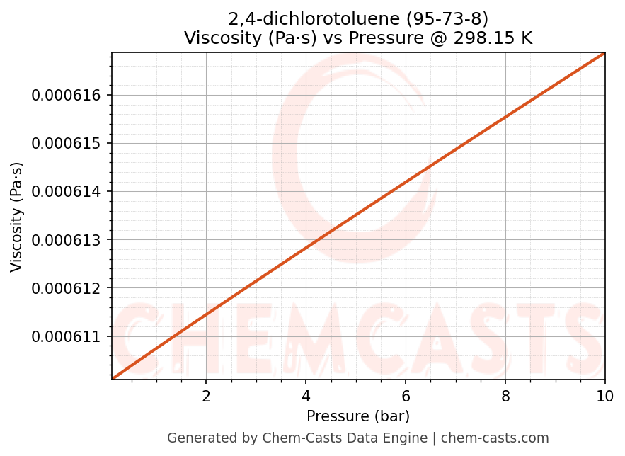 This page presents the pressure-dependent thermodynamic and transport properties of 2,4-dichlorotoluene (CAS 95-73-8) calculated at a constant temperature of 298 K (25 °C) over the pressure range 0.10-10 bar.