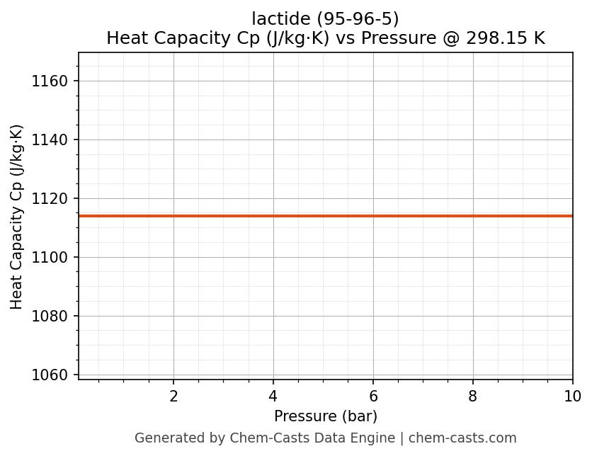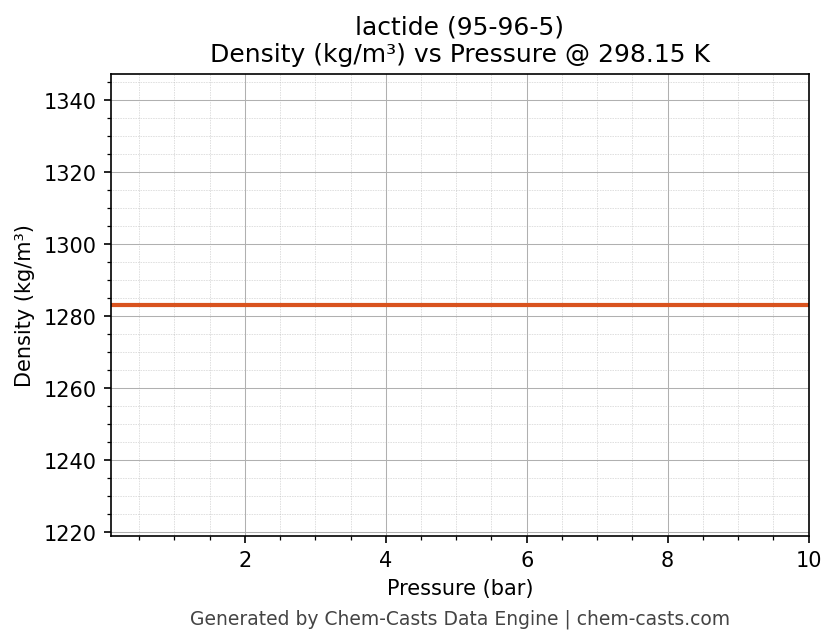 This page presents the pressure-dependent thermodynamic and transport properties of lactide (CAS 95-96-5) calculated at a constant temperature of 298 K (25 °C) over the pressure range 0.10-10 bar.