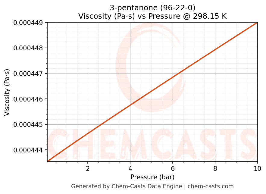 This page presents the pressure-dependent thermodynamic and transport properties of 3-pentanone (CAS 96-22-0) calculated at a constant temperature of 298 K (25 °C) over the pressure range 0.10-10 bar.