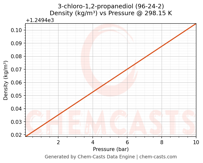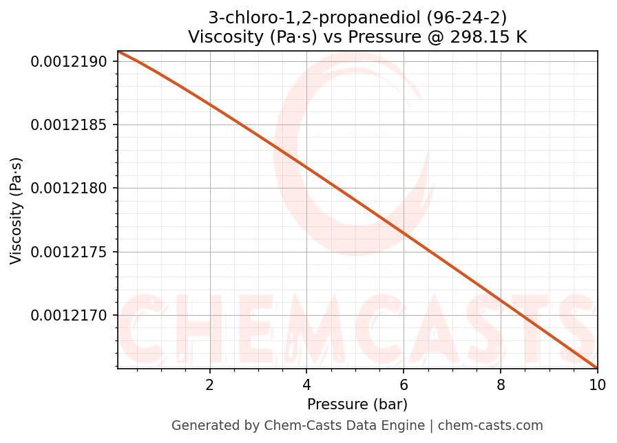 This page presents the pressure-dependent thermodynamic and transport properties of 3-chloro-1,2-propanediol (CAS 96-24-2) calculated at a constant temperature of 298 K (25 °C) over the pressure range 0.10-10 bar.