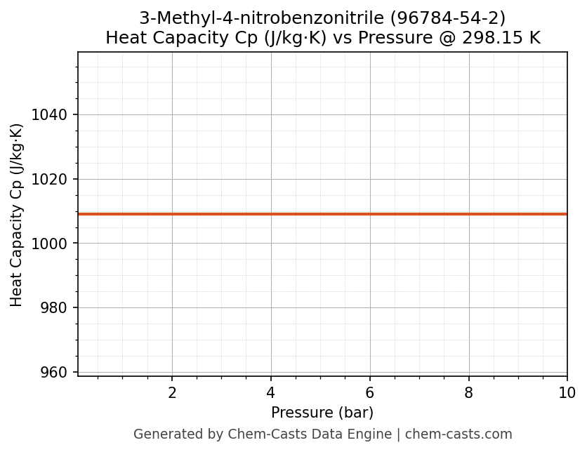 This page presents the pressure-dependent thermodynamic and transport properties of 3-Methyl-4-nitrobenzonitrile (CAS 96784-54-2) calculated at a constant temperature of 298 K (25 °C) over the pressure range 0.10-10 bar.