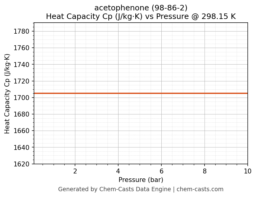 This page presents the pressure-dependent thermodynamic and transport properties of acetophenone (CAS 98-86-2) calculated at a constant temperature of 298 K (25 °C) over the pressure range 0.10-10 bar.