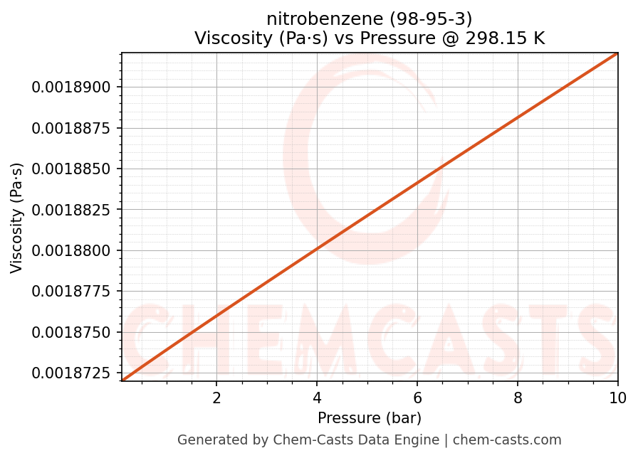 This page presents the pressure-dependent thermodynamic and transport properties of nitrobenzene (CAS 98-95-3) calculated at a constant temperature of 298 K (25 °C) over the pressure range 0.10-10 bar.