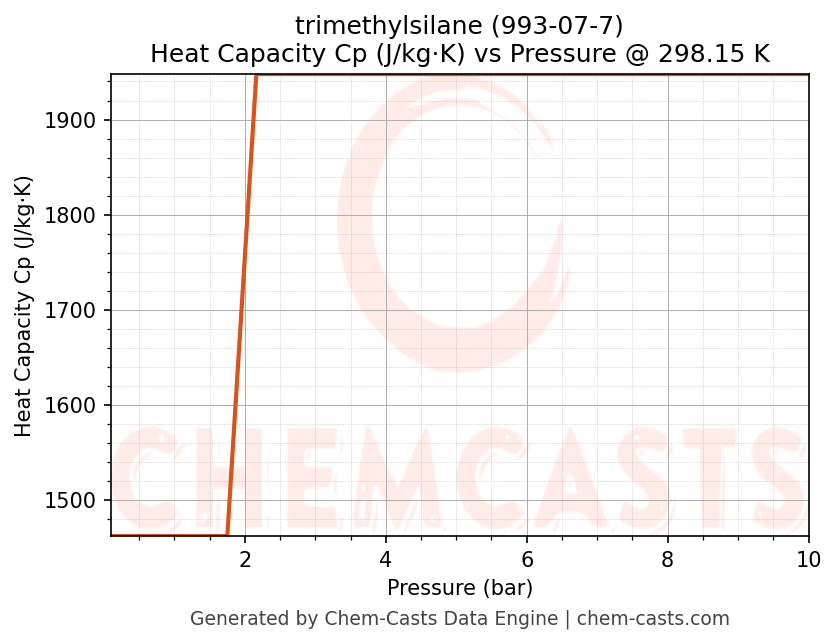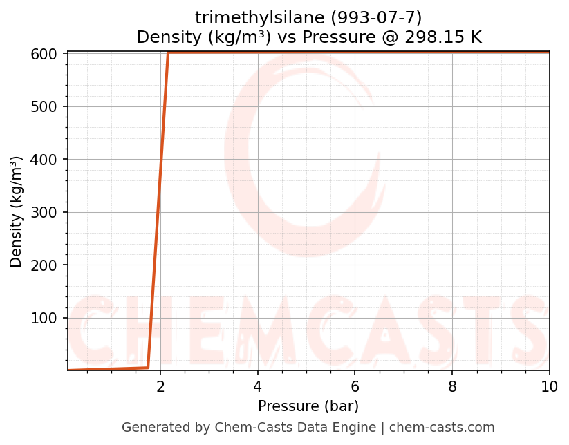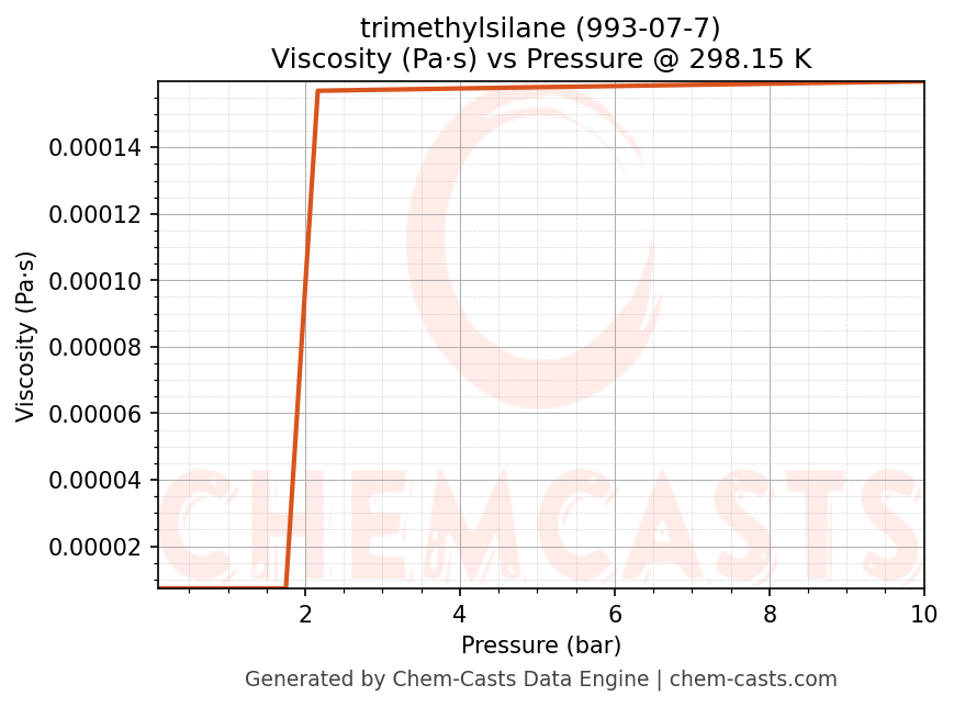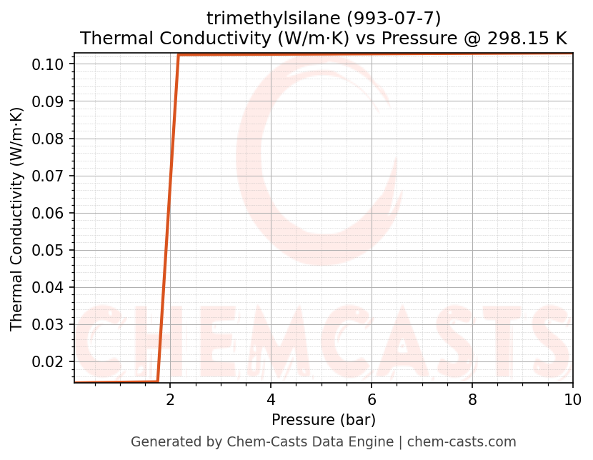 This page presents the pressure-dependent thermodynamic and transport properties of trimethylsilane (CAS 993-07-7) calculated at a constant temperature of 298 K (25 °C) over the pressure range 0.10-10 bar.