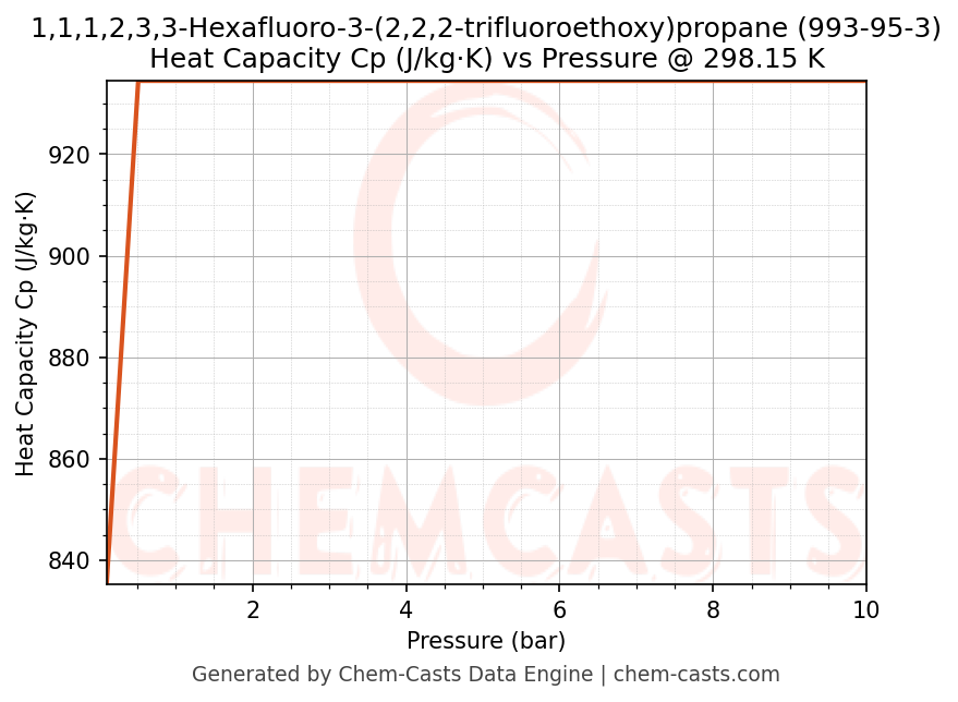 This page presents the pressure-dependent thermodynamic and transport properties of 1,1,1,2,3,3-Hexafluoro-3-(2,2,2-trifluoroethoxy)propane (CAS 993-95-3) calculated at a constant temperature of 298 K (25 °C) over the pressure range 0.10-10 bar.