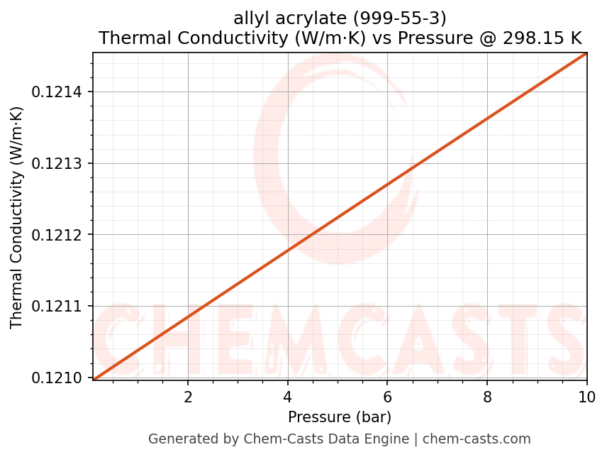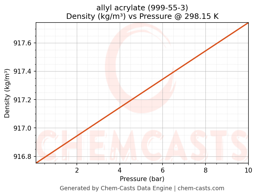 This page presents the pressure-dependent thermodynamic and transport properties of allyl acrylate (CAS 999-55-3) calculated at a constant temperature of 298 K (25 °C) over the pressure range 0.10-10 bar.